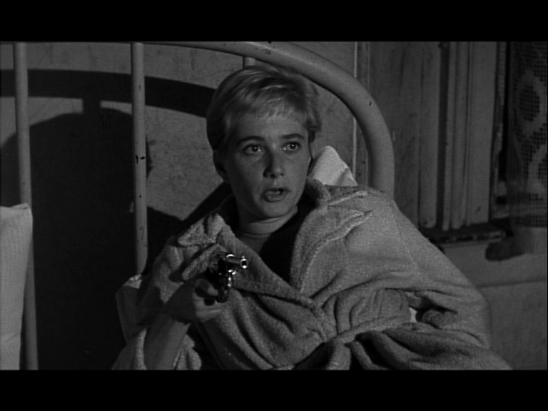 Eine Ausnahme ist “Kiss Me Deadly”, wo die von Detektiv Mike Hammer verfolgte Frau ihn in ihrem Zimmer erwartet – und mit einer Pistole bedroht (“Kiss Me Deadly, 1955):
