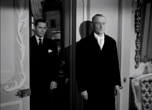 Daraufhin wirft Gilda ihren Kopf zurück (in der Nahaufnahme fliegen ihre Haare dramaturgisch vollendet) und erblickt die beiden. Sie lächelt und fragt neckisch: “Me?!”, doch als sie Johnny wiedererkennt, verschwindet ihr Lächeln. Sie gibt sich einen Träger ihres Negligées auf die Schulter zurück (der andere bleibt unten) und erwidert “Sure, I’m decent”.